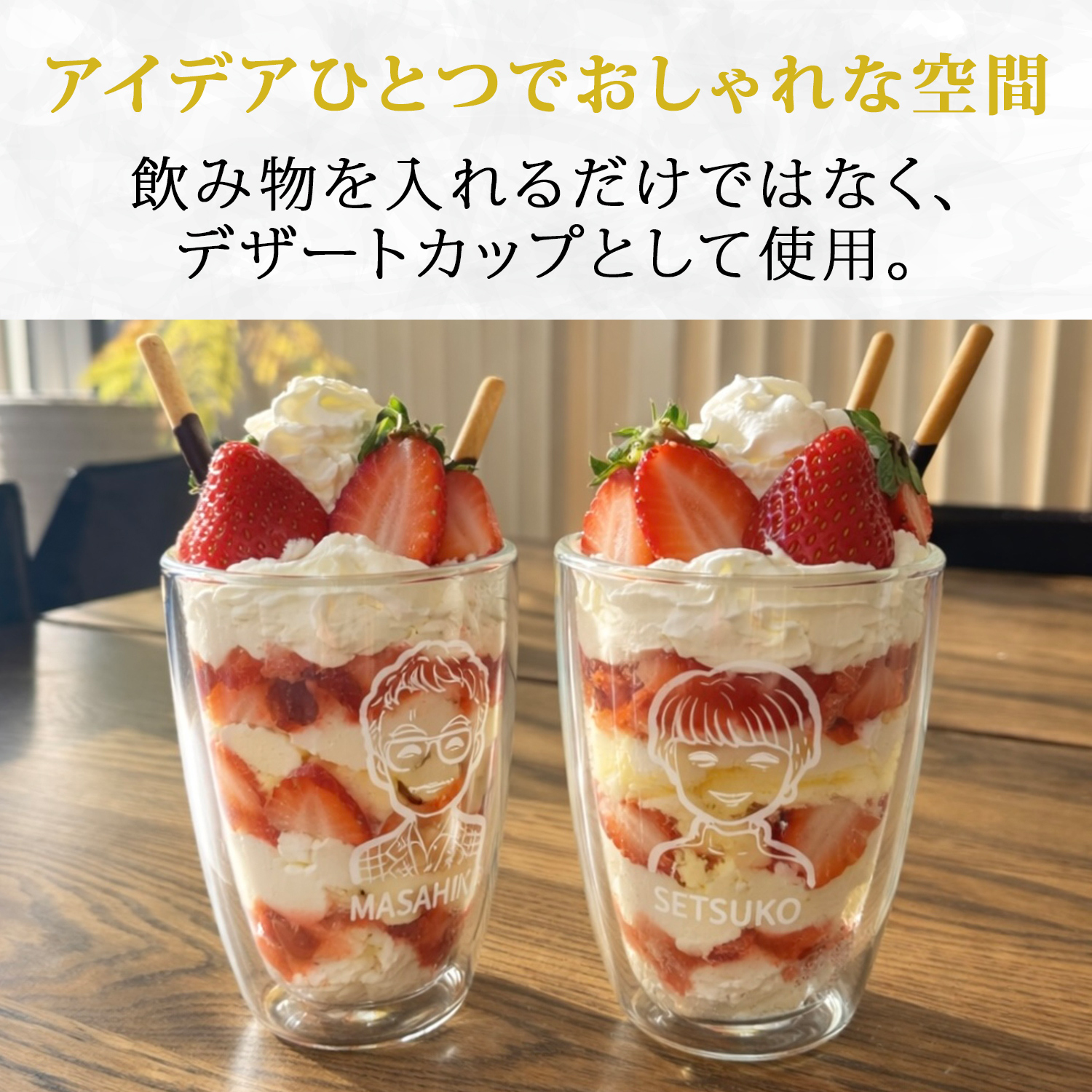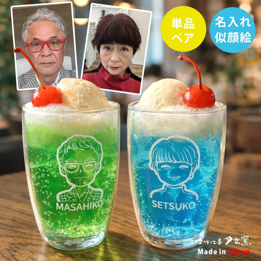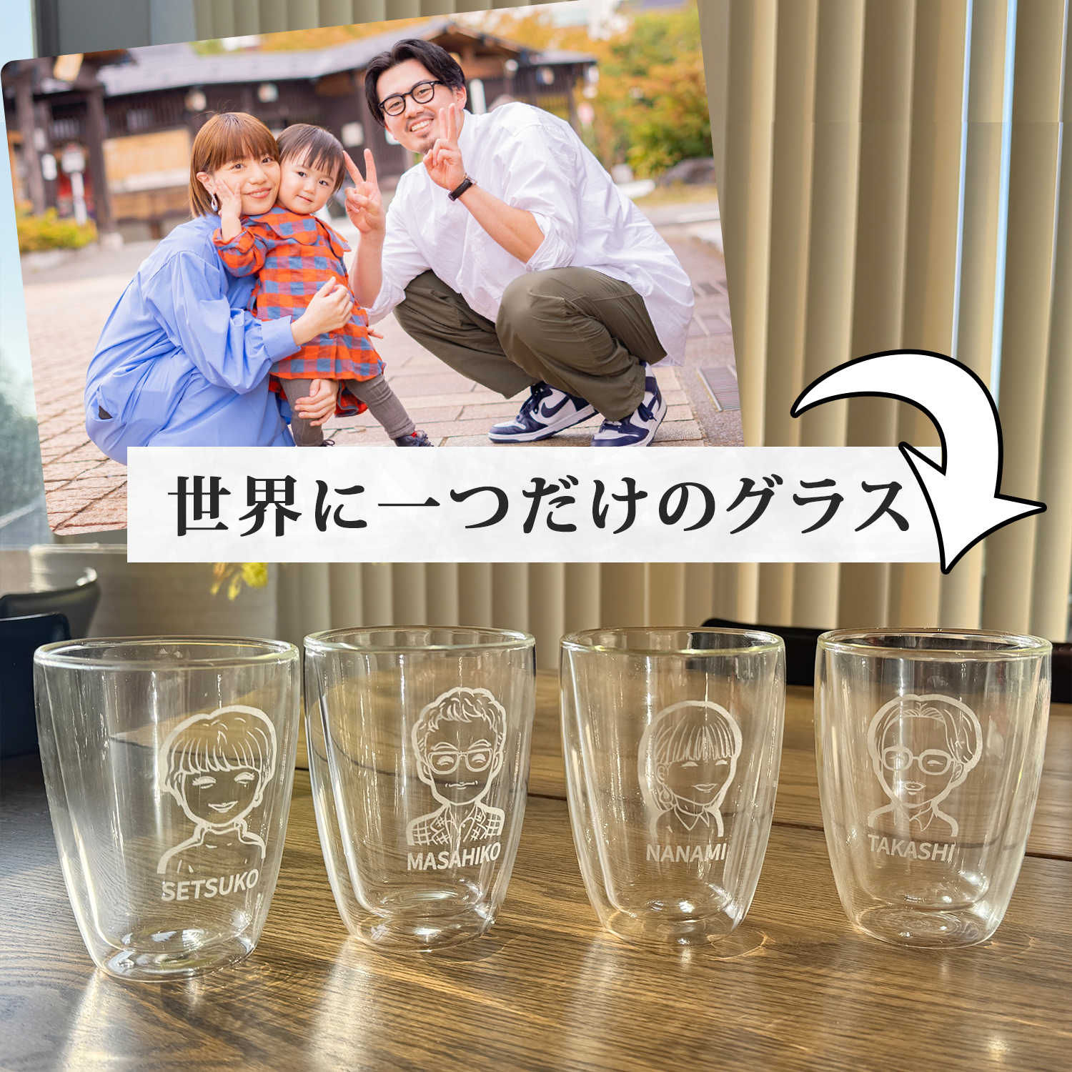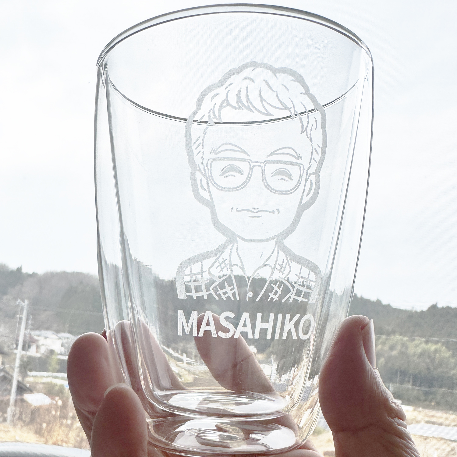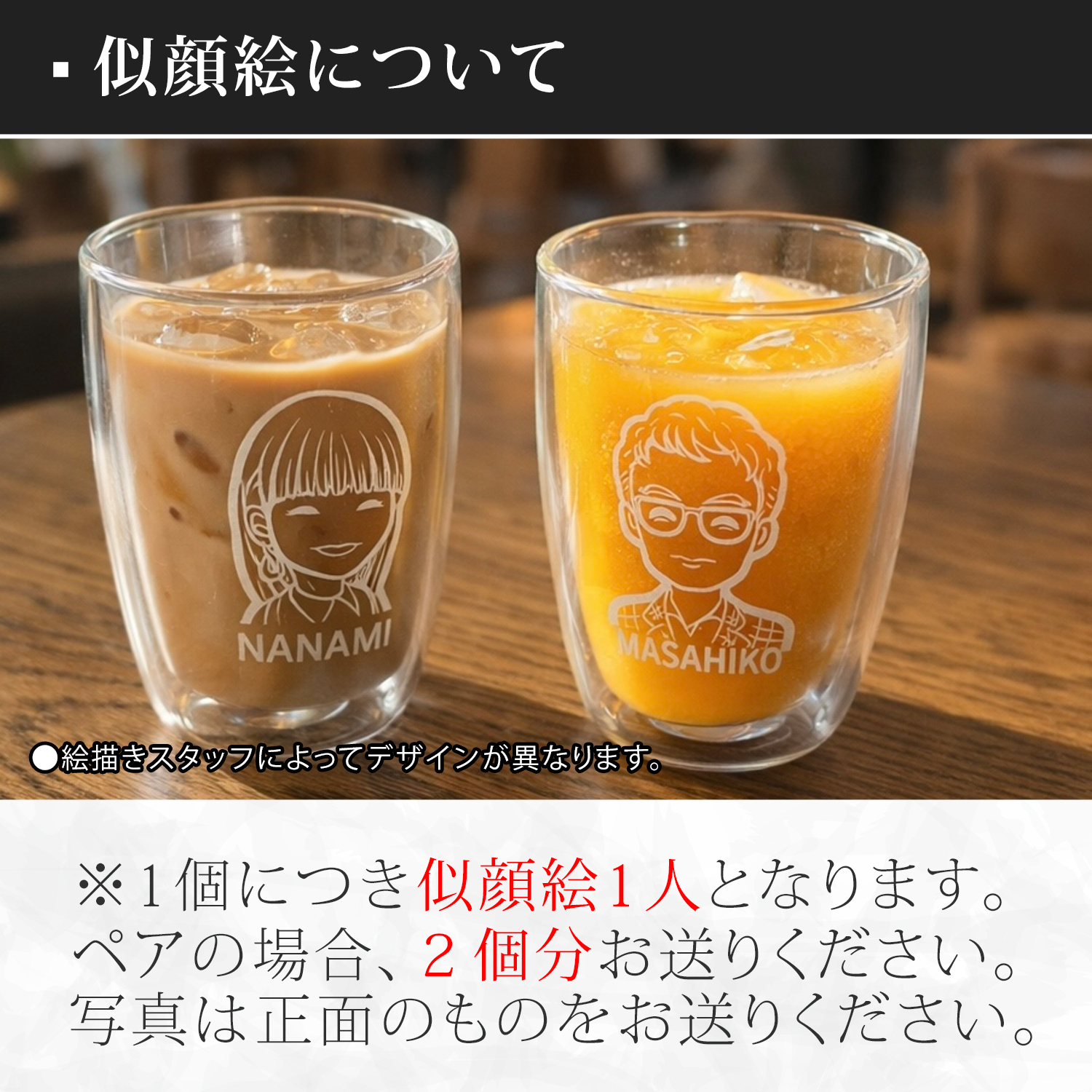 送っていただいた写真を元にデザイナーが似顔絵を描いたダブルウォールグラス