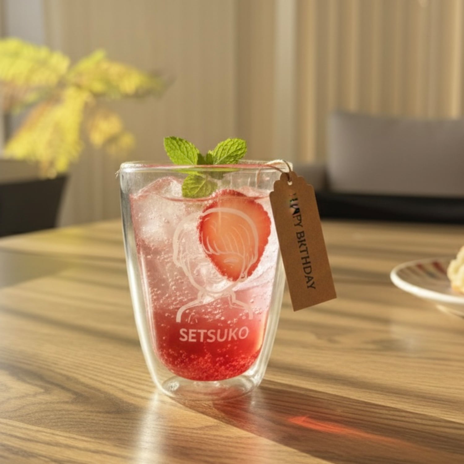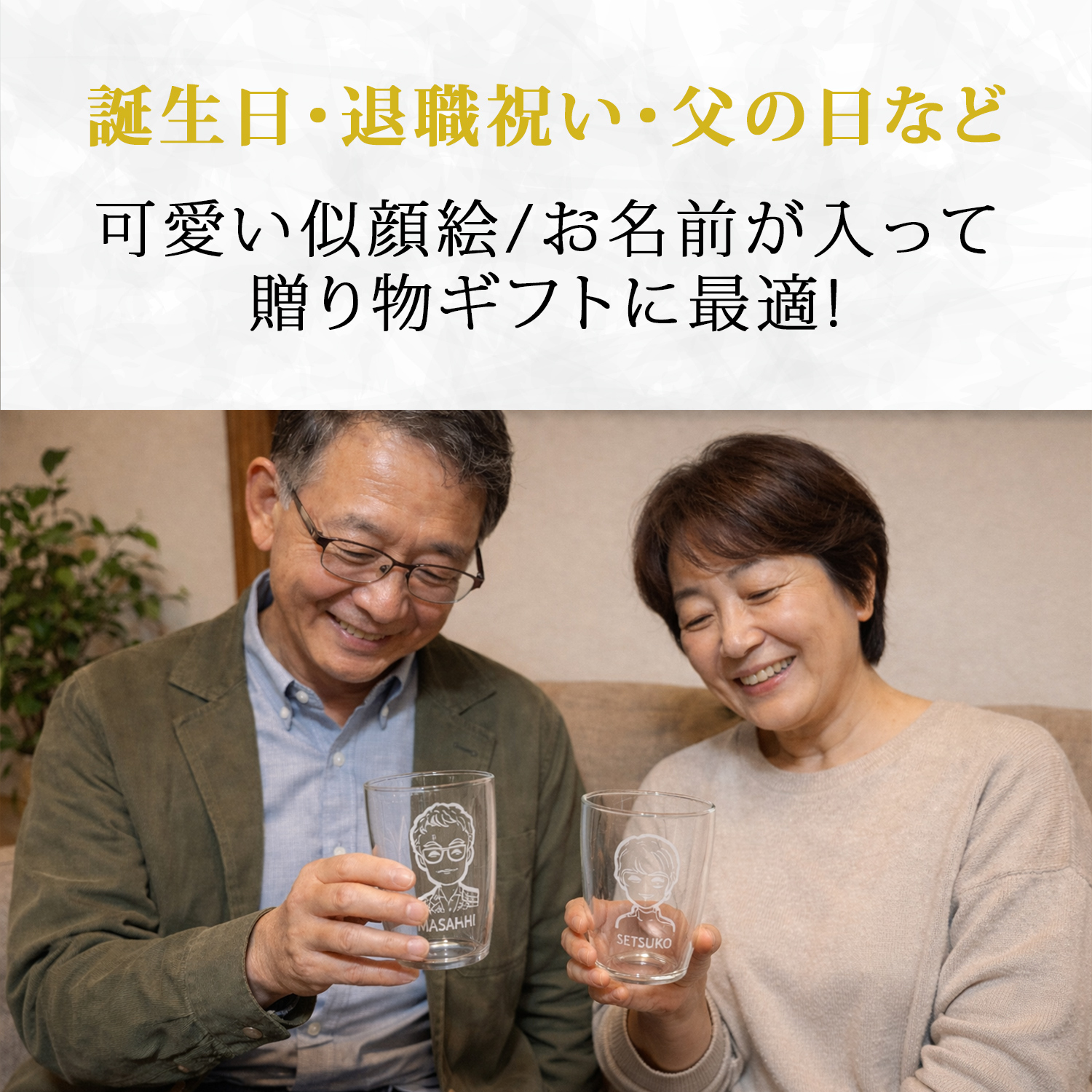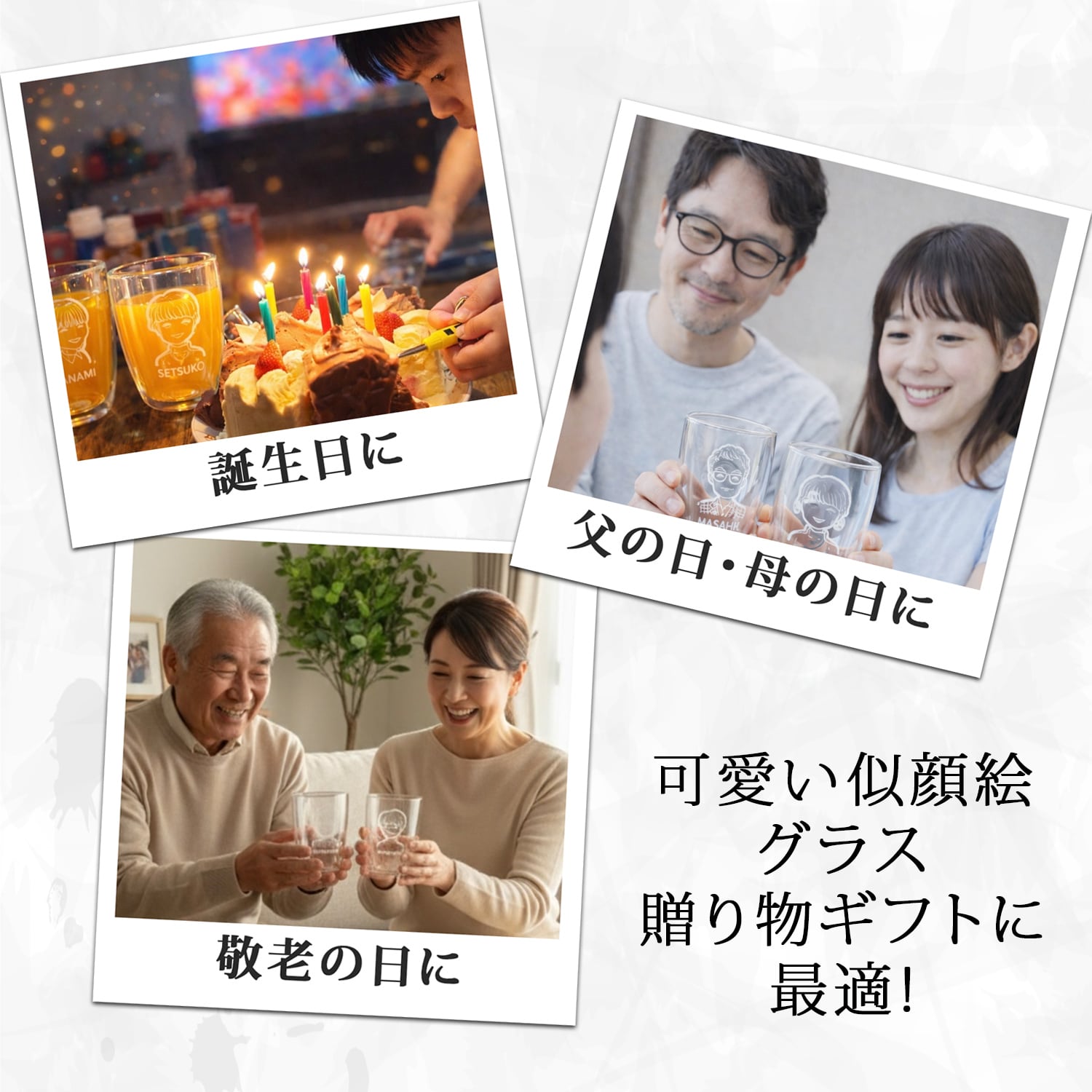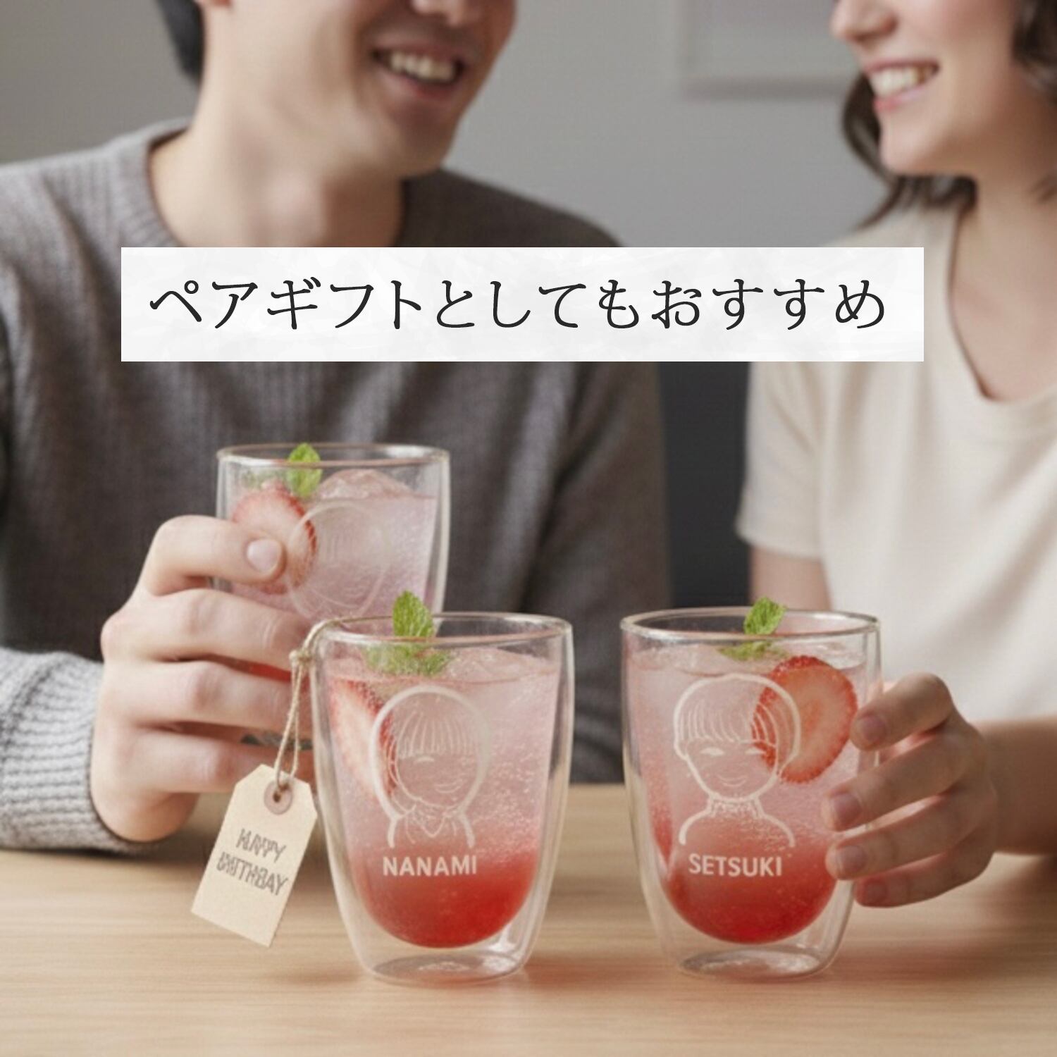 送っていただいた写真を元にデザイナーが似顔絵を描いたダブルウォールグラス