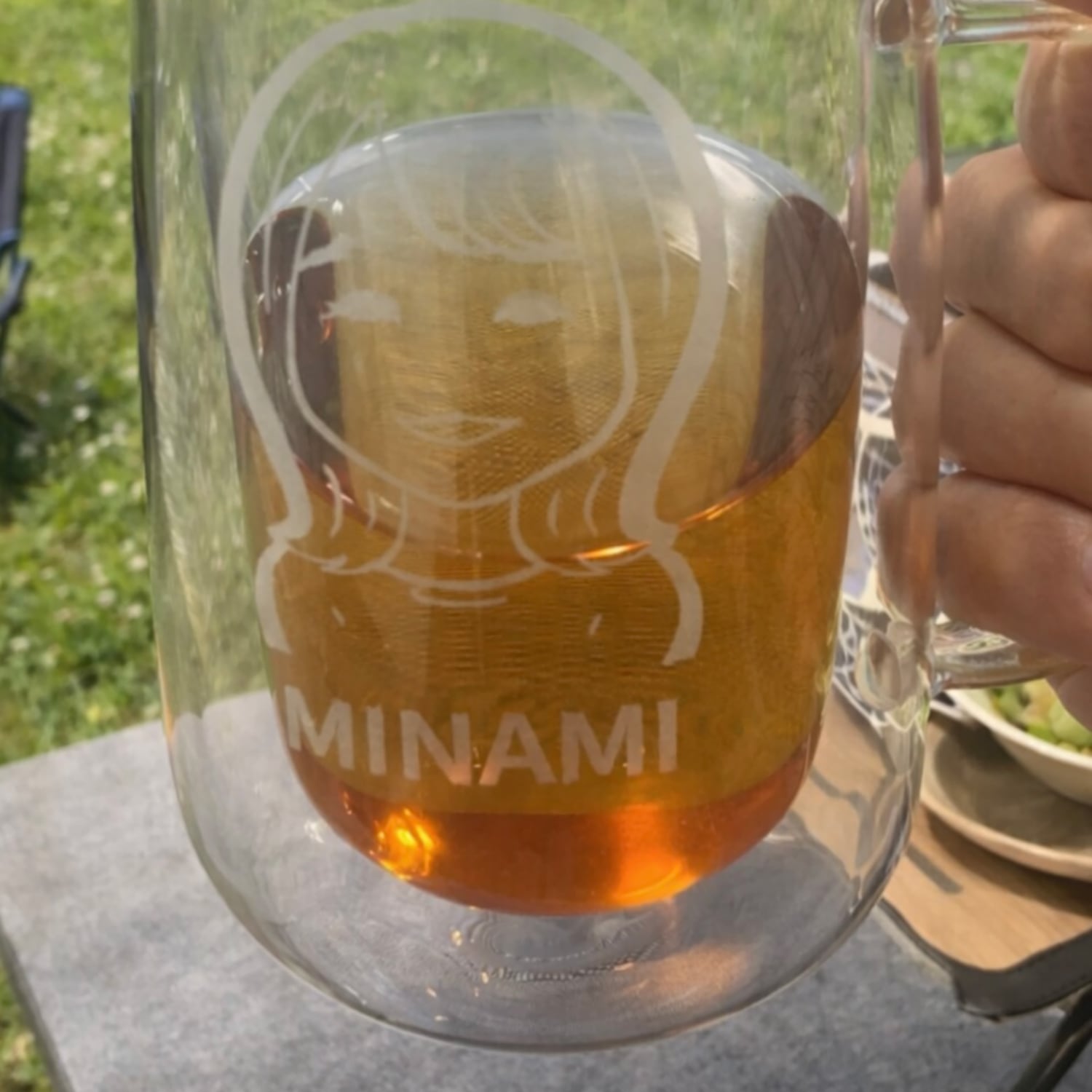 送っていただいた写真を元にデザイナーが似顔絵を描いたダブルウォールマググラス